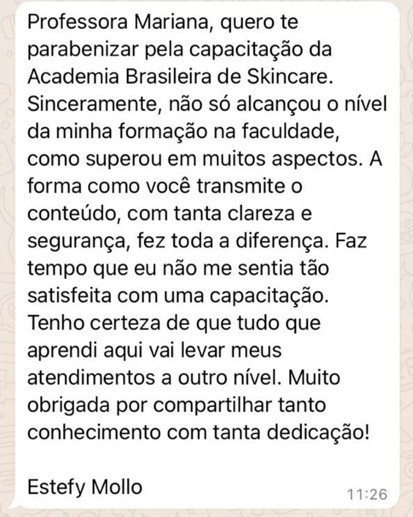 Minha trajetória é pautada no compromisso com o estudo aprofundado da pele e dos cosméticos, aliando a teoria científica à aplicação prática de resultados reais e seguros.Atuo desde 2019 exclusivamente na área da estética avançada e da cosmetologia aplicada.